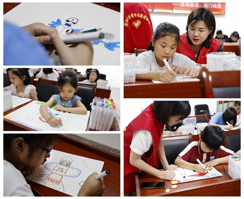用筆觸描繪夢(mèng)想,用色彩擁抱生活,在“我的夢(mèng)想”創(chuàng)意繪畫環(huán)節(jié),老師和志愿者們向孩子們講解了本次繪畫的主題及表現(xiàn)方式等內(nèi)容,并進(jìn)行了創(chuàng)作指導(dǎo)。稚嫩的小手握著五彩的畫筆,孩子們以飽滿的熱情投入繪畫,充分發(fā)揮各自的想象力、創(chuàng)造力,無拘無束地構(gòu)思畫面、大膽創(chuàng)作,揮灑天馬行空,一條線、一點(diǎn)墨,處處閃耀著創(chuàng)作的靈感,真正把夢(mèng)想留在了紙上,種在了心里。